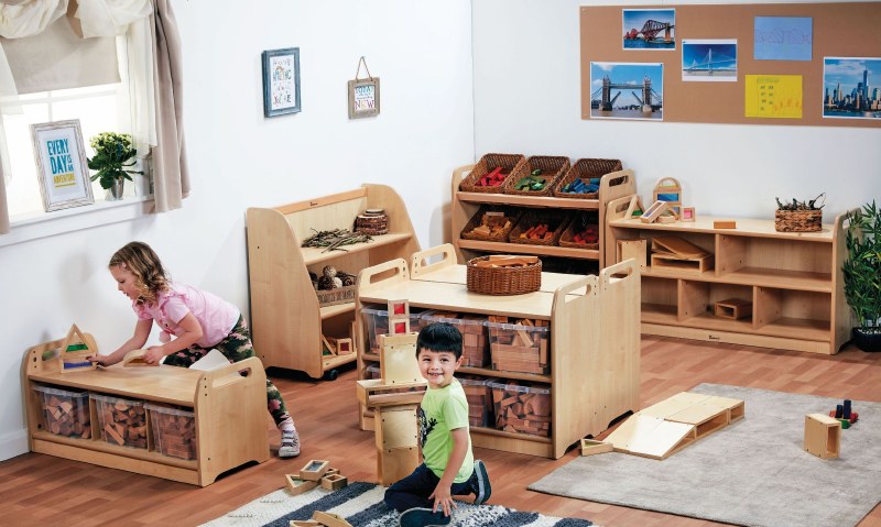 Problem solving, cooperative play and hand-eye coordination are just some of the many skillls that construction play helps to promote. Our Construction Zone combines versatile storage and different types of blocks to create the ideal construction play space. The Low and Tall Block Units come fully furnished with three different types of natural bricks.